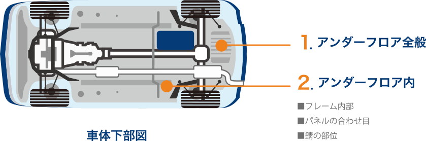 アンダーフロアには、鋼版合わせ目や袋状内部に浸透性防錆剤の噴霧・防錆アンダーコートの塗布が必要です。
